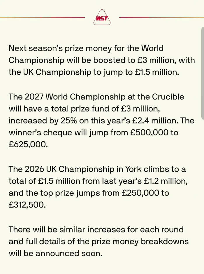 世锦赛总奖金池由240万英镑提升至300万英镑,冠军奖金从50万英镑(RMB461万)暴涨至62.5万英镑(RMB575万),涨幅达25%;英锦赛总奖金升至150万英镑,冠军奖金31.25万英镑,同样刷新历史纪录。而大师赛冠军奖金在上赛季已经由25万英镑提升到35万英镑,墨菲成了大师赛历史单站奖金最高的那位。上赛季世界大奖赛冠军奖金也由12万英镑提升至18万英镑,被尼尔·罗伯逊所夺!余下站次的奖金也将同步迎来提升,这是斯诺克商业价值与竞技热度同步攀升所必需的!